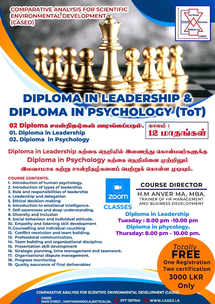The Diploma in Leadership and Psychology is a comprehensive 12-month program designed to provide Tamil-speaking individuals and designed to deliver via Tamil language with essential skills in leadership and psychology. Delivered online, this program offers a balanced approach to understanding psychological principles and applying them to leadership roles, enhancing both personal and professional growth.