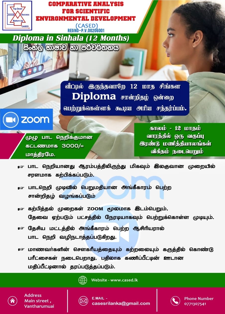 The Institute of Comparative Analysis for Scientific Environmental Development (CASED) is pleased to announce its comprehensive Diploma in Sinhala Language Skills program, offered entirely online via Zoom. This 12-month course is meticulously designed to enhance proficiency in the Sinhala language for designed for Tamil-speaking individuals and designed to deliver via Tamil language, providing systematic instruction in advanced grammar, vocabulary, writing, and conversational skills. The curriculum aims to equip participants with extensive language capabilities suitable for both professional and personal contexts, fostering social cohesion and mutual understanding among diverse communities.